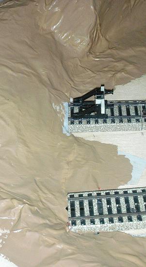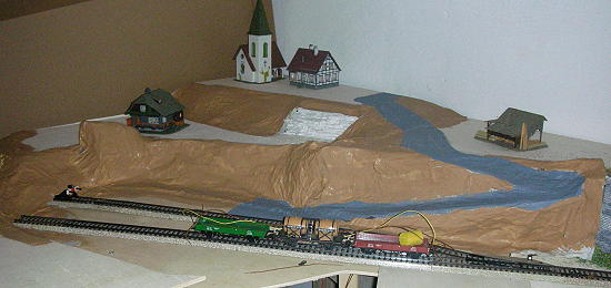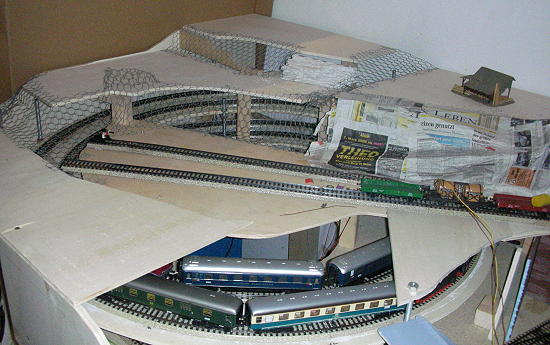 Nach kurzer Urlaubspause geht es weiter. Der Berg wird mit Hasendraht bespannt und dann mit Zeitung belegt, die reichlich mit Tapetenkleister bestrichen ist. Ich