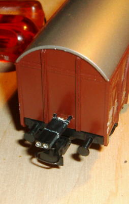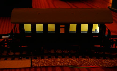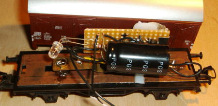 Ich habe einen kleinen Personenzug mit einem gedeckten Güterwagen als Abschluß versehen. In diesem befindet sich ein Gleichrichter und ein großer Kondensator.