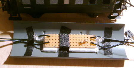 Dadurch flackert nichts und die LEDs brennen sogar noch etwas nach. Von Waggon zu Waggon führen 2 Leitungen gleichgerichteter Strom. Im Waggon sind kleine Platinen mit je einem Vorwiderstand und 2 LEDs vorhanden.